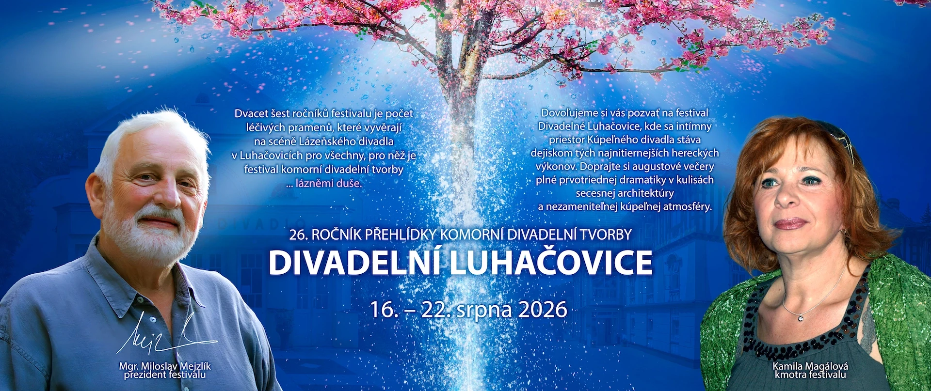 „Festival Divadelní Luhačovice oslaví své úctyhodné narozeniny právě v tomto roce. Je to již celé čtvrť století, kdy město Luhačovice přivítá týdenní divadelní večery pro milovníky a obdivovatele jevištního umění.“